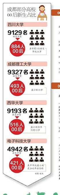 四川大學(xué)公布的新生大數(shù)據(jù)中,9129名新生中,00后高達(dá)884人,其中有3位新生年僅14歲;成都理工大學(xué)9327名新生中,有493名00后,最小的15歲;而在西華大學(xué)9193名本科生中,1998年和1999年出生的新生達(dá)到7473人,占總?cè)藬?shù)的81.3%,00后有516人,最小的今年只有13歲;在電子科技大學(xué)今年4942名本科生新生中,00后有421名,其中年紀(jì)最小的是2002年出生的。