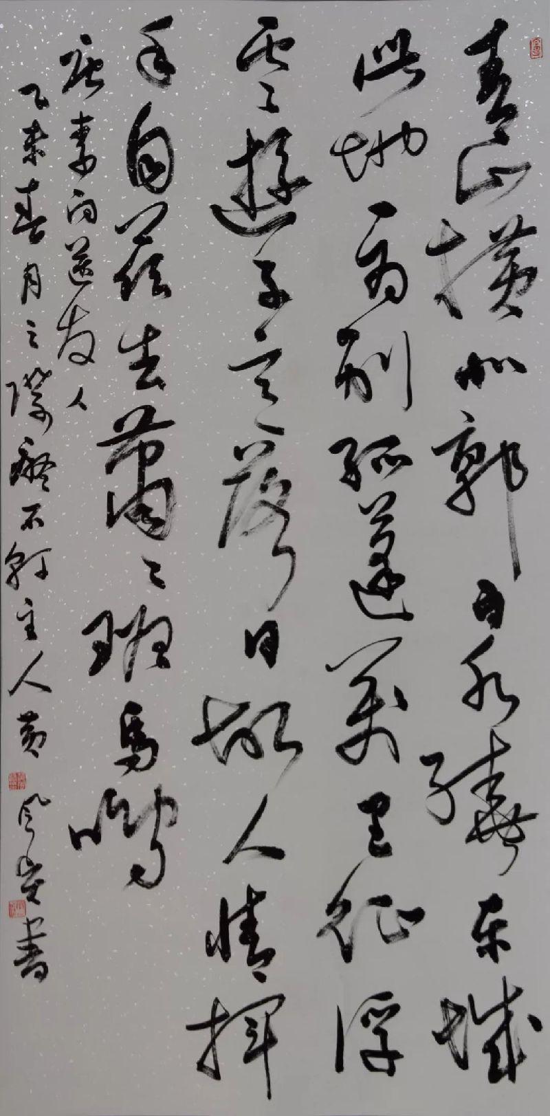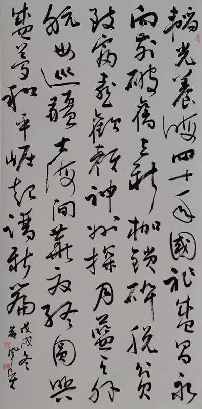 他的書法以行草為主,旁涉篆隸,行草在王鐸、米芾間停留時間較長,近年潛心于孫過庭《書譜》,繼而上溯王羲之,走著這樣一個純粹的帖學正脈。他的行草很少受時風的干擾,沿著這樣一個主線慢慢的浸潤,打磨,最終形成了自己的獨特面目。作品結體極具張力,筆法嫻熟,行氣貫通,線條勁健,筆底提按頓挫分明,墨色變化自然,透過痛快淋漓的技法表達,可以感受到一股幽雅的氣息,是典型的文人書法。