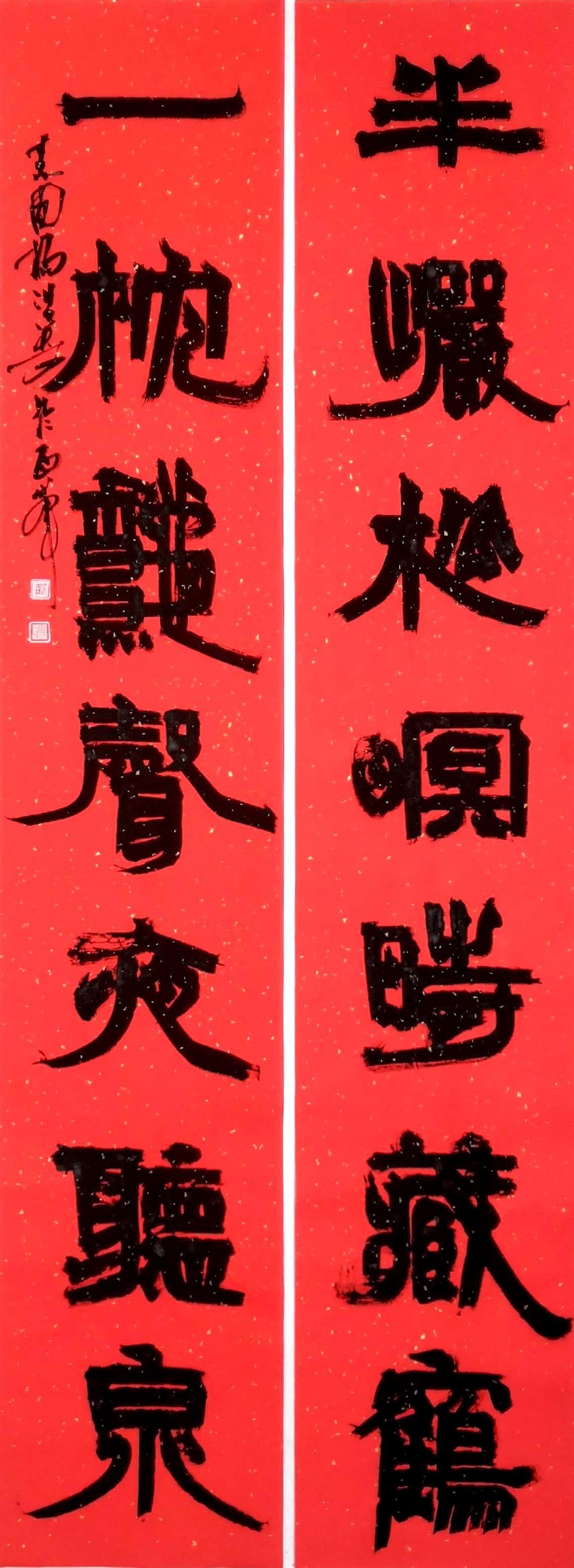 ??????? 當(dāng)你仔細(xì)品味其五體兼?zhèn)涞木妨ψ鲿r(shí),處處折射著充沛的創(chuàng)作活力,鮮活的視覺形象,高品位的技術(shù)素質(zhì)和其所包含的傳統(tǒng)精神充滿字里行間。他要把篆入隸,要把簡(jiǎn)帛納入,要把魏的剛健、晉的飄逸、漢的肅穆、唐的華貴、宋元明清意趣都吸收進(jìn)來(lái),增強(qiáng)質(zhì)感的展現(xiàn)及審美耐看性趣味性的表達(dá),使線條語(yǔ)言更具意味、更為豐富,更加高檔次??臻g結(jié)構(gòu)跌宕起伏有如“危峰阻日”,筆勢(shì)蒼勁流暢,有如“云鶴游天”。像鄭板橋所言:“掀天揭地之文,震電驚雷之字,呵神罵鬼之談,無(wú)古無(wú)今之畫,故不在尋常蹊徑中也”。臨池百家而撮其一要,任情驅(qū)使而根植傳統(tǒng)。字里行間鬼使神斧,件件作品奇而不怪。呈現(xiàn)給人們的是一股正大氣象,與那些嬌聲嗲氣,矯揉造作,無(wú)病呻吟或故弄玄虛者形成了顯明對(duì)比。在他的筆墨空間里處處洋溢著當(dāng)代青年朝氣蓬勃,勇于創(chuàng)新的雄強(qiáng)豪邁之氣。