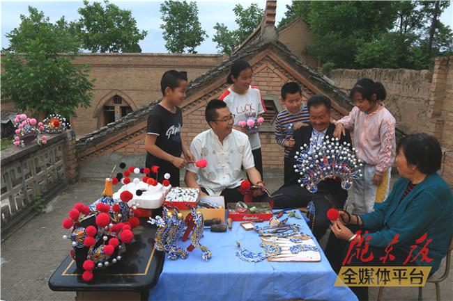 寧縣戲劇頭帽傳承人楊維成給兒子和孫子孫女傳授頭帽制作技藝(2020年5月23日攝)。特約攝影?李建琪?攝? ?