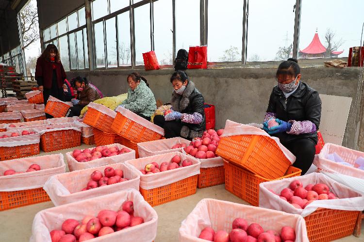 合水縣新興有機農產品農民專業合作社內,來自四川的客商正在分揀裝箱蘋果。