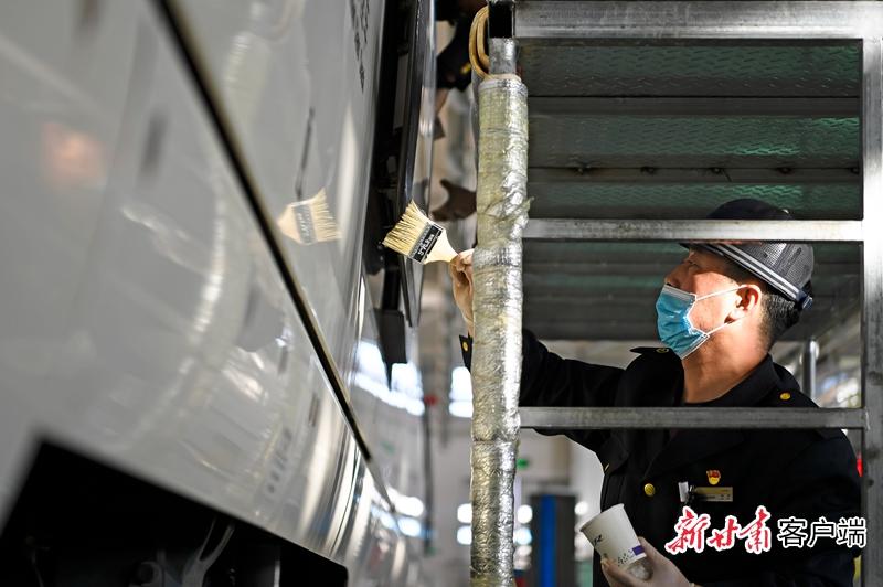 銀川動(dòng)車運(yùn)用所技術(shù)工正在對(duì)車門進(jìn)行保養(yǎng)。