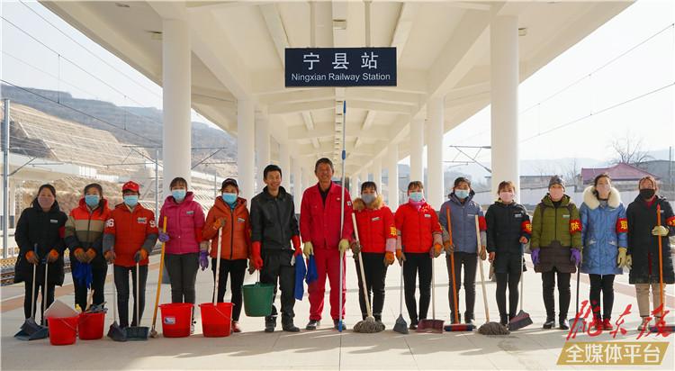 ????慶陽網訊(記者 路世玲) “來,姐妹們,咱們動作麻利點,把活干得漂亮些。”12月17日,在銀西高鐵寧縣站4號站臺,一名中等身材、容貌清秀的女子帶領著七八個女保潔員用清潔工具正在認真地擦拭和打掃站臺黃色候車區域衛生。
