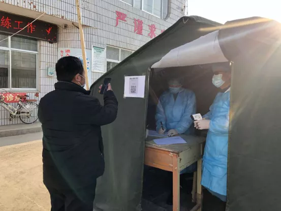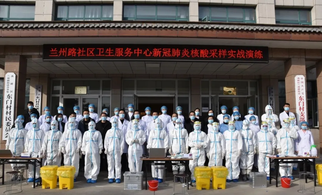 ????院外演練地點(diǎn)選擇空曠、通風(fēng)良好的蘭州路社區(qū)東門村村委會作為大規(guī)模人群篩查集中采樣地點(diǎn),并根據(jù)現(xiàn)場條件,劃分出等候區(qū)、緩沖區(qū)、采樣區(qū)等多個區(qū)域。150余名采樣居民分3組,間隔一米排隊(duì)依次進(jìn)行測溫、身份驗(yàn)證登記、咽拭子采樣等環(huán)節(jié)。