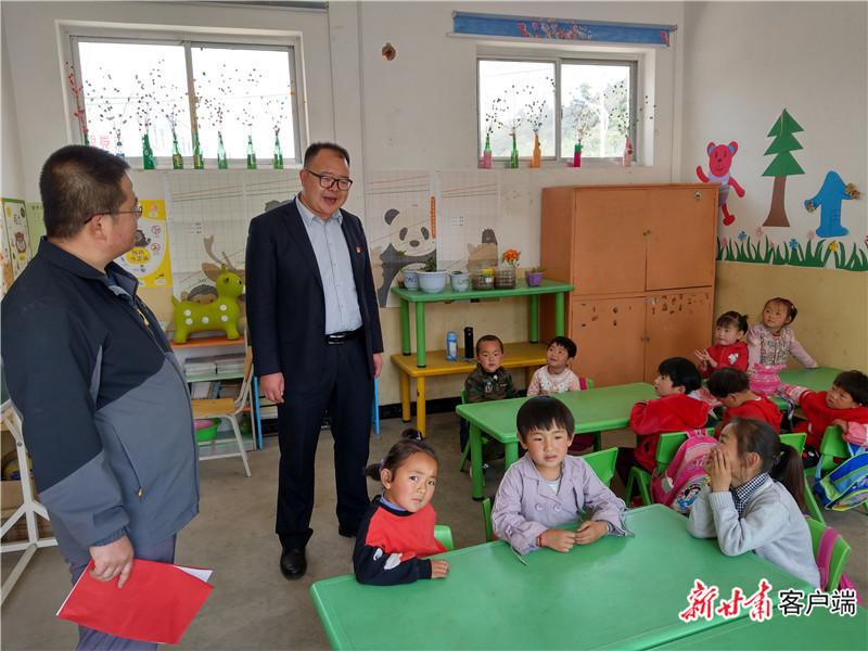 2019年5月9日,邱軍(左二)在華池縣城壕鎮太陽幼兒園了解辦學情況。