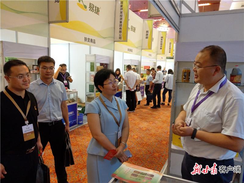 2019年9月10日,邱軍(右一)在易捷扶貧展銷會上推薦華池農特產品。