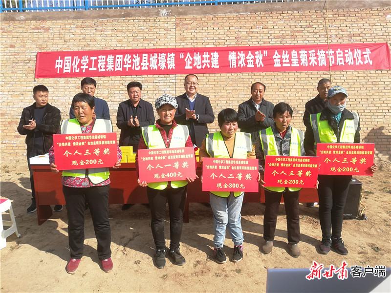 2020年10月29日,邱軍(后排右三)參加華池縣“金絲皇菊”采摘儀式。