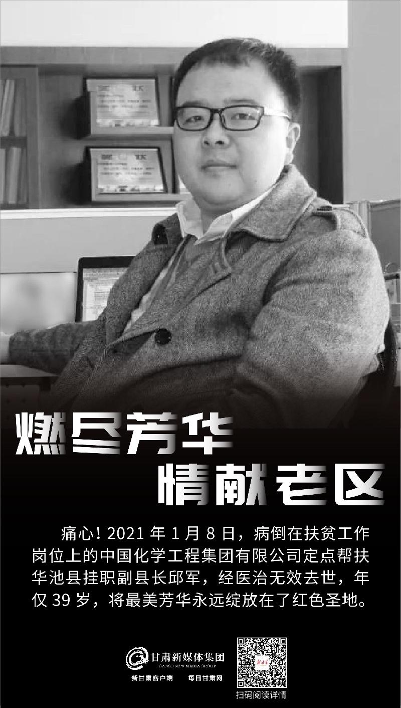 2021年1月8日下午,因搶救無效,中國化學工程集團有限公司定點幫扶華池縣掛職副縣長邱軍,永遠地離開了熱愛的華池土地,年僅39歲。