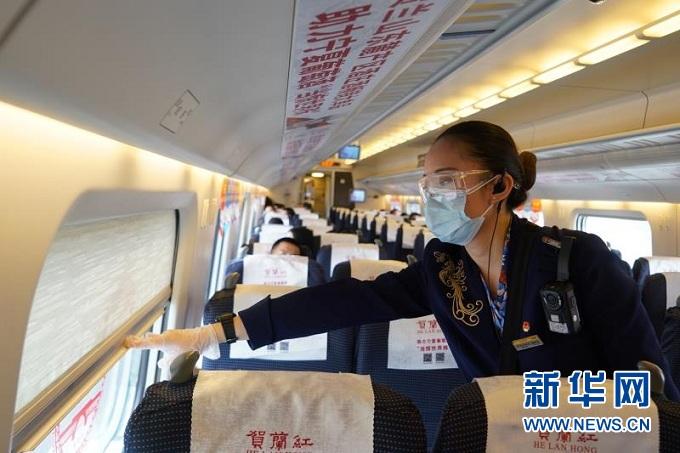 銀西高鐵線路列車上,一名列車員為旅客拉下窗簾。(中國鐵路蘭州局集團(tuán)有限公司供圖)