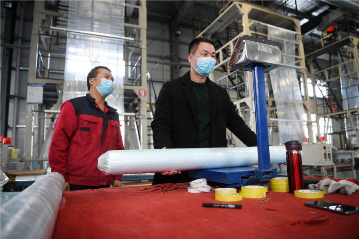 2022年1月28日,閩商鄭開煌(右)在位于寧夏隆德縣閩寧扶貧產(chǎn)業(yè)園的農(nóng)用薄膜生產(chǎn)線查看產(chǎn)品質(zhì)量。新華社記者 王鵬 攝
