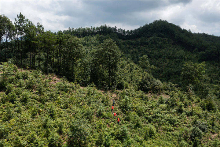 在浙江省杭州市臨安區(qū)太湖源鎮(zhèn)上陽村重陽塢,志愿者在“碳中和林”進(jìn)行日常巡查(2021年7月20日攝,無人機(jī)照片)。新華社記者 徐昱 攝