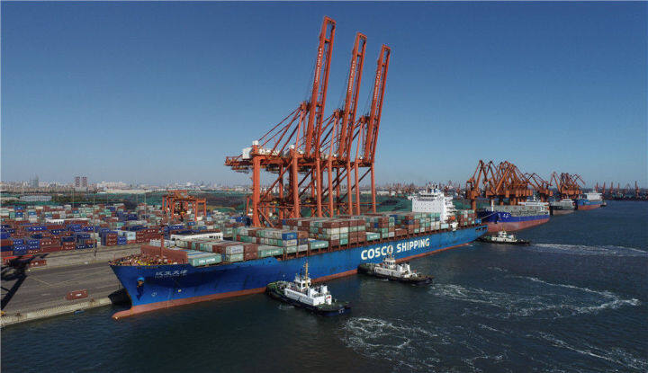 一艘輪船在拖輪的協(xié)助下向唐山港京唐港區(qū)集裝箱碼頭靠泊(2021年10月23日攝,無人機(jī)照片)。新華社記者 朱旭東 攝