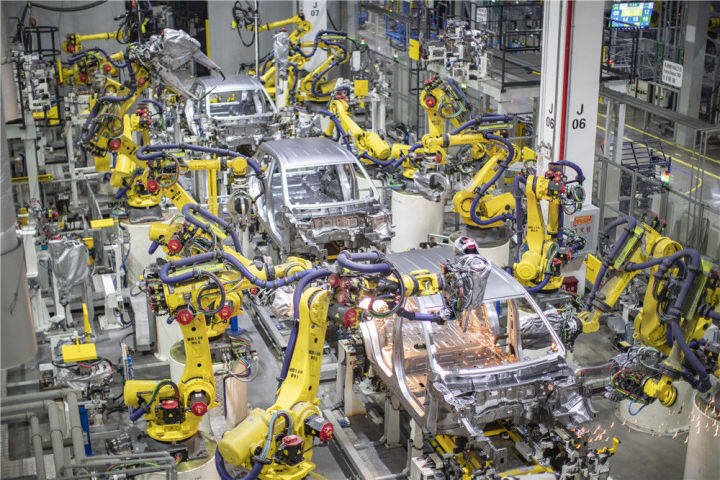 重慶一家新能源汽車企業(yè)使用智能化焊接機(jī)器人進(jìn)行焊接作業(yè)(2021年4月2日攝)。新華社記者 黃偉 攝