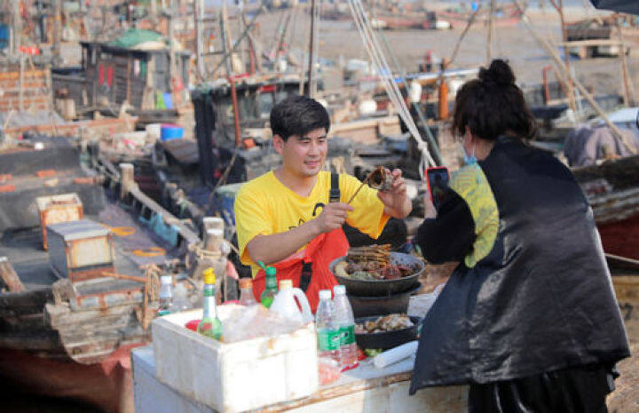 江蘇省連云港市海頭鎮,“網紅主播”到漁船邊拍攝短視頻(2020年6月10日攝)。新華社記者李雨澤攝