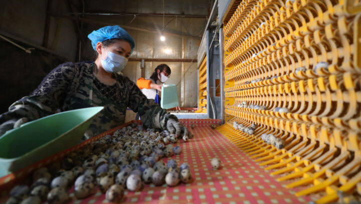 1月27日,在遼寧省遼陽縣壯大畜牧養殖專業合作社,工人在收集分揀鵪鶉蛋。新華社記者楊青攝