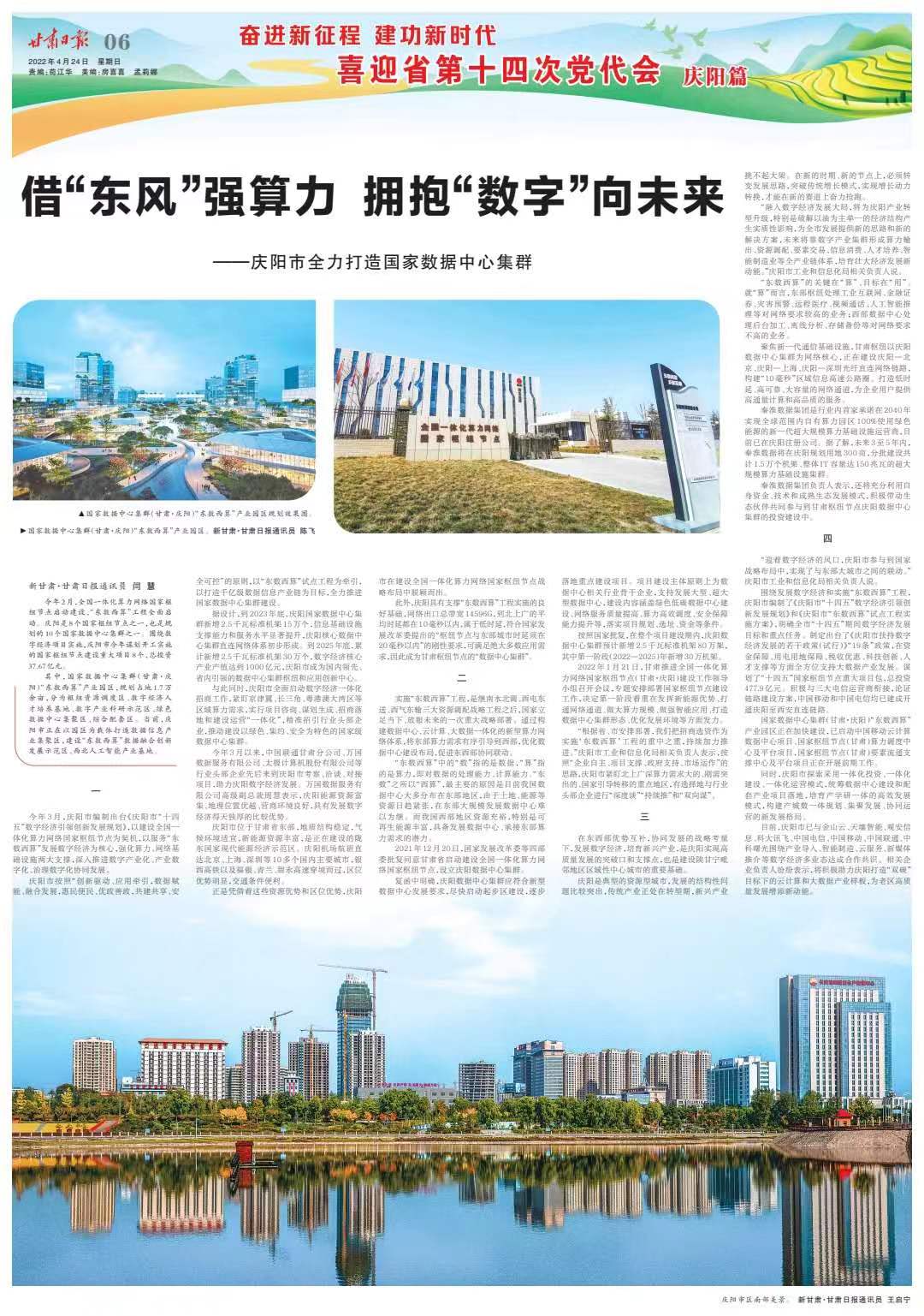 2021年12月20日,國家發展改革委等四部委批復同意甘肅省啟動建設全國一體化算力網絡國家樞紐節點,設立慶陽數據中心集群。