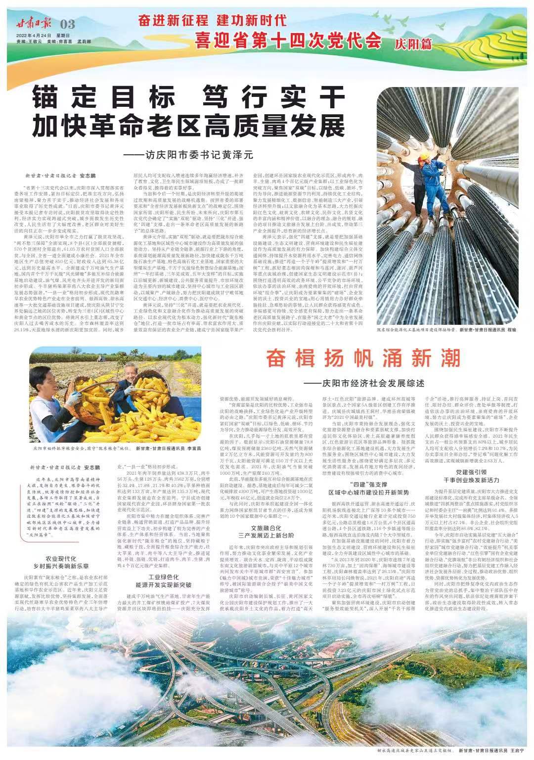 黃澤元說,慶陽市舉全市之力打贏了脫貧攻堅戰,“兩不愁三保障”全面實現,8個縣(區)全部脫貧摘帽,570個貧困村全部退出,61.05萬農村貧困人口全部脫貧,與全國、全省一道全面建成小康社會。2021年全市地區生產總值突破850億元,財政收入達到65.38億元,達到歷史最高水平。全面建成千萬噸油氣生產基地,國內首個千萬千瓦級“風光儲輸”多能互補綜合能源基地啟動建設,油氣煤、風光電齊頭并進開發的新局面初步形成。牛羊豬雞果菜草藥八大農業主導產業集群發展態勢強勁,“一縣一業”格局初步形成,現代絲路寒旱農業優勢特色產業走在全省前列。銀西高鐵、甜永高速等一大批交通基礎設施項目建成,使慶陽從陜甘寧交界處偏遠之地的區位劣勢,轉變為三省(區)區域性中心和黃金節點的區位優勢。將黃河水引上董志塬,改變了慶陽人過去喝苦咸水的歷史。全市森林覆蓋率達到26.15%,天藍地綠水清的新慶陽更加宜居。同時,城鄉居民人均可支配收入增速連續多年跑贏經濟增速,補齊了教育、文化、衛生等民生領域弱項短板,辦成了一批群眾看得見、摸得著的實事好事。