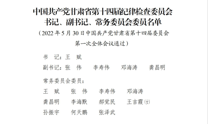 中國共產黨甘肅省第十四屆紀律檢查委員會書記、副書記、常務委員會委員名單