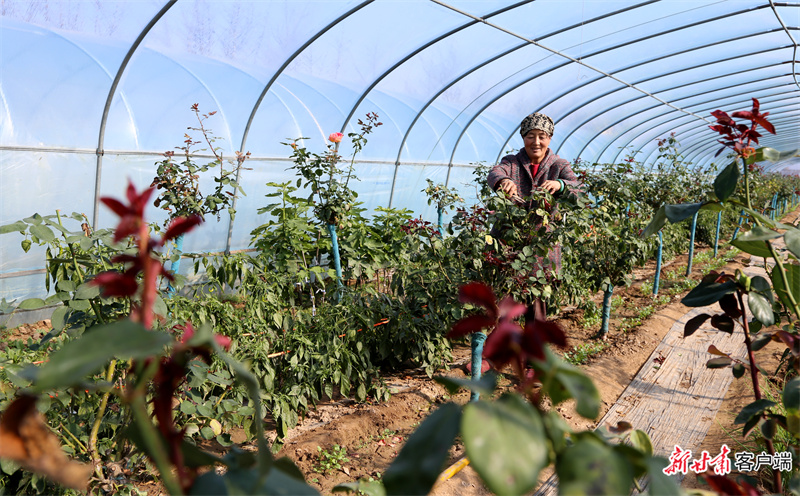 西峰區后官寨鎮司官寨村村民修剪大棚里的月季。