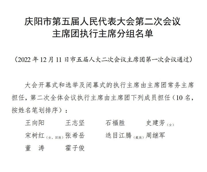【受權發布】慶陽市第五屆人民代表大會第二次會議主席團執行主席分組名單
