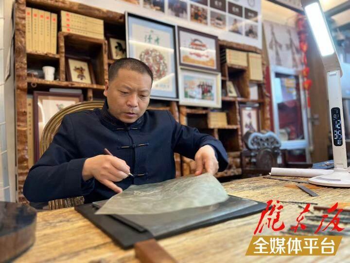 1月12日,在環(huán)州故城道情皮影館內(nèi),41歲的張治文伏于桌案,左手轉(zhuǎn)動(dòng)牛皮,右手執(zhí)刀雕刻,十幾把刀在張治文手中來回轉(zhuǎn)換,鋒利的刀尖在牛皮上時(shí)而扎、時(shí)而推、時(shí)而鑿,經(jīng)過四個(gè)多小時(shí)的精心打磨,一幅傳統(tǒng)皮影與現(xiàn)代潮流元素相融合的“年畫兔”栩栩如生地呈現(xiàn)了出來。