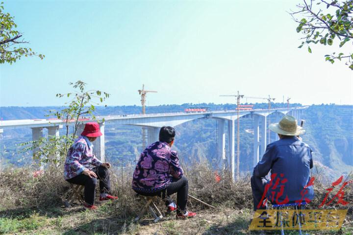 寧縣早勝鎮曹家村老人目睹甜永高速天寧溝大橋合龍。陳飛 攝