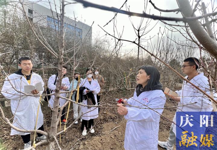 采訪進行了沒多久,張慶霞就穿上白大褂,拿起修枝剪,急匆匆地前往櫻桃園,給學生們上課。在隴東學院的櫻桃園里,張慶霞手拿修枝剪,給學生們講解櫻桃樹的修剪訣竅。“這片櫻桃園里共有40多棵櫻桃樹,包含了紅燈、美早、桑提娜、魯櫻3號等品種,便于學生們觀察學習不同品種的櫻桃樹在慶陽的生長情況。”張慶霞說。