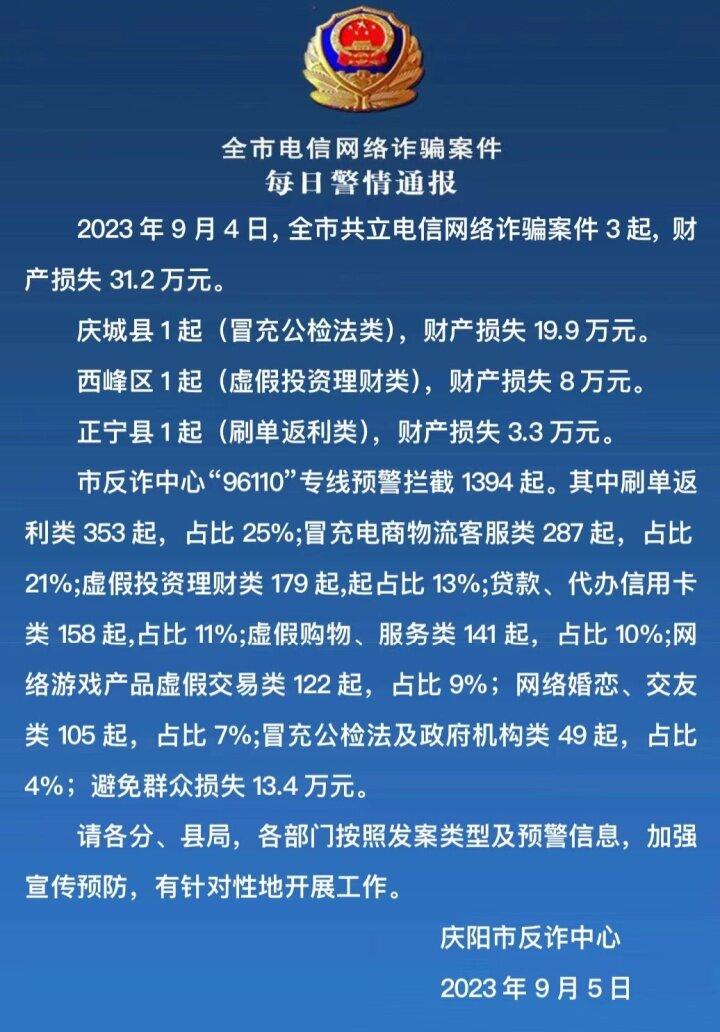 【法治慶陽】立案3起,財產損失31.2萬元!慶陽市發布9月4日電信網絡詐騙案件警情通報