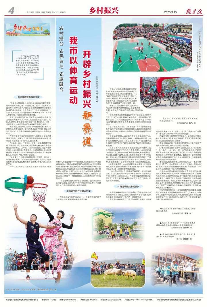 今年以來(lái),慶陽(yáng)市農(nóng)村全民健身氛圍日趨濃厚,除籃球賽外,環(huán)縣首屆“羊羊”運(yùn)動(dòng)會(huì)、華池縣喬川鄉(xiāng)“全民健身煥活力·振興鄉(xiāng)村新征程”農(nóng)民運(yùn)動(dòng)會(huì)、華池縣悅樂(lè)鎮(zhèn)“前園子杯”農(nóng)民運(yùn)動(dòng)會(huì)、環(huán)縣車(chē)道鎮(zhèn)安掌村農(nóng)民趣味運(yùn)動(dòng)會(huì)、環(huán)縣耿灣鄉(xiāng)2023年農(nóng)民運(yùn)動(dòng)會(huì)、環(huán)州故城萬(wàn)人越野賽、慶陽(yáng)市2023年自行車(chē)比賽等多項(xiàng)精彩賽事接連舉辦,這些賽事攜新風(fēng)、聚合力,在慶陽(yáng)廣袤的大地上描繪了一幅幅健康向上、充滿(mǎn)活力的鄉(xiāng)村和美場(chǎng)景。