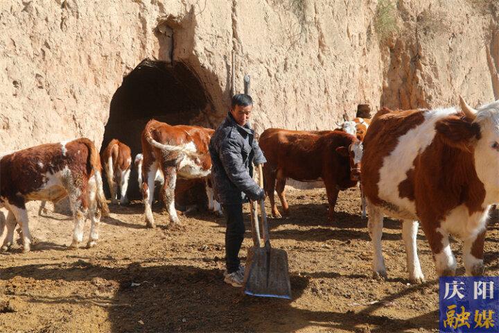 正寧縣嘉鑫樂家庭農場主肖永平清理牛圈。