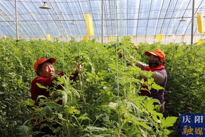 正寧縣現代農業示范園內,群眾在打理西紅柿藤蔓。
