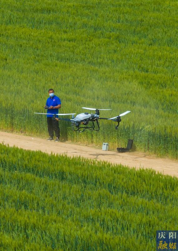 會(huì)前,與會(huì)人員前往鎮(zhèn)原縣屯字鎮(zhèn)馬堡村千畝綠色高質(zhì)高效冬小麥種植示范點(diǎn)現(xiàn)場(chǎng)觀摩冬小麥“一噴三防”作業(yè)演示。