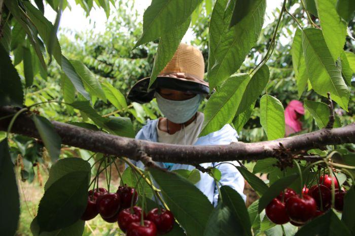 而就在基地生產車間不遠處的采摘基地,一棵棵樹下掛滿了紫紅色的車厘子,個個飽滿有光澤,散發著誘人香味,工人們正忙著采摘成熟的車厘子。
