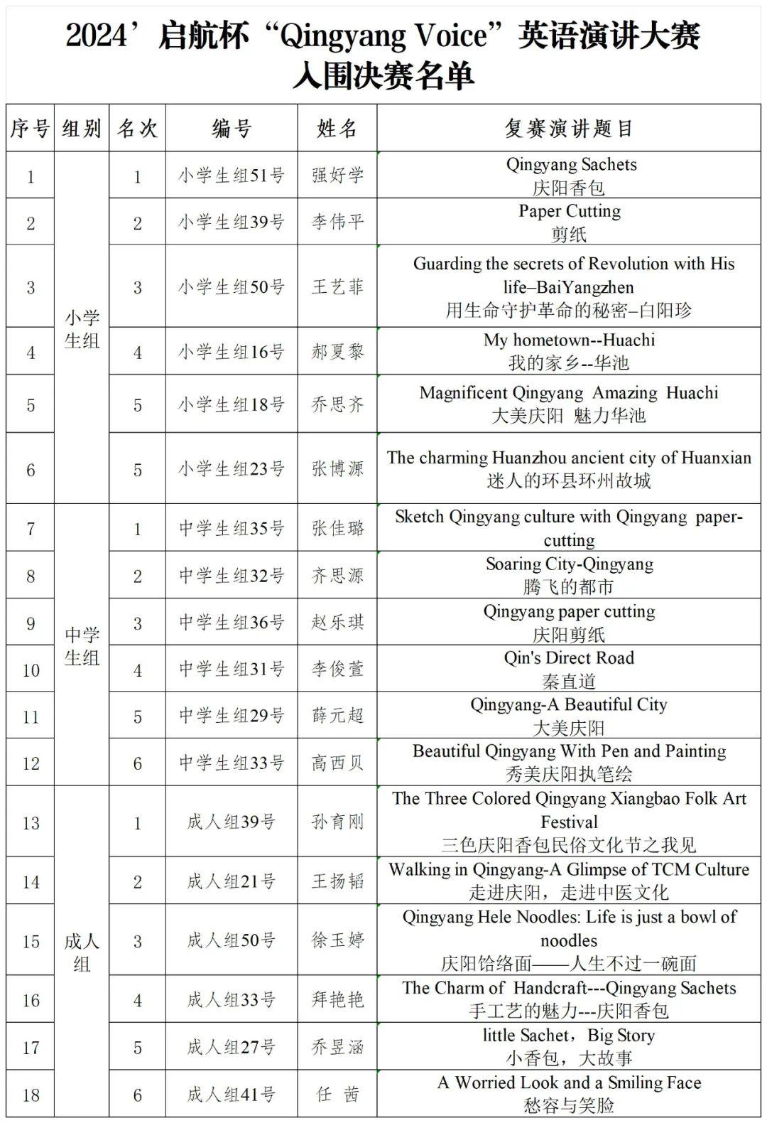 2024’啟航杯“QingyangVoice”英語演講大賽復賽于2024年7月15日至7月26日舉行,經專家評委評審,三個組別共18名選手入圍決賽。現將名單公示如下: