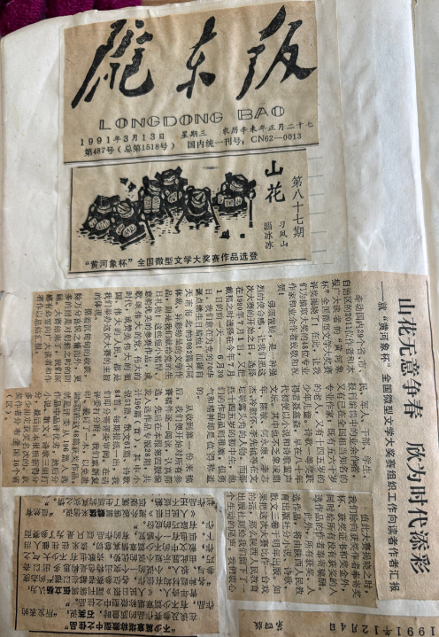 幾天后,一篇題為《黃色遐思》的散文終于誕生了,這篇短文通過一系列的聯(lián)想與描述,表達(dá)了自己對黃土地、華夏民族以及偉大祖國的無限感激與熱愛。1991年1月13日晚上,我將最終定稿的散文《黃色遐思》工工整整地寫在自己特意買來的稿紙上,小心翼翼地裝進(jìn)信封,第二天,騎自行車冒著刺骨的寒風(fēng)到五公里之外的縣城郵局去郵寄。稿件寄出之時(shí),我仿佛完成了一份光榮的任務(wù)。盡管之前自己已經(jīng)在其他報(bào)紙上發(fā)表過幾篇習(xí)作,但這次畢竟是第一次給心目中神圣的家鄉(xiāng)報(bào)紙《隴東報(bào)》投稿,心里既興奮又緊張。驚喜有時(shí)會在不經(jīng)意間突然降臨。近兩個(gè)月之后,我驚喜地發(fā)現(xiàn)自己的散文《黃色遐思》刊發(fā)在1991年3月13日的《隴東報(bào)》第四版“黃河象杯”全國微型文學(xué)大獎(jiǎng)賽專版上。不久,我便收到了編輯部寄來的墨香濃郁的樣報(bào)。