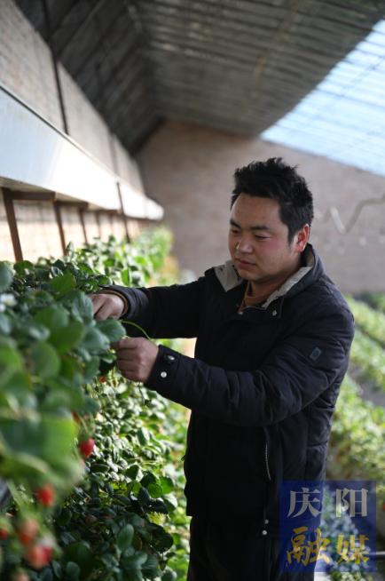 合水縣固城鎮董家寺村酸甜可口的奶油草莓吸引游客紛紛前來采摘。