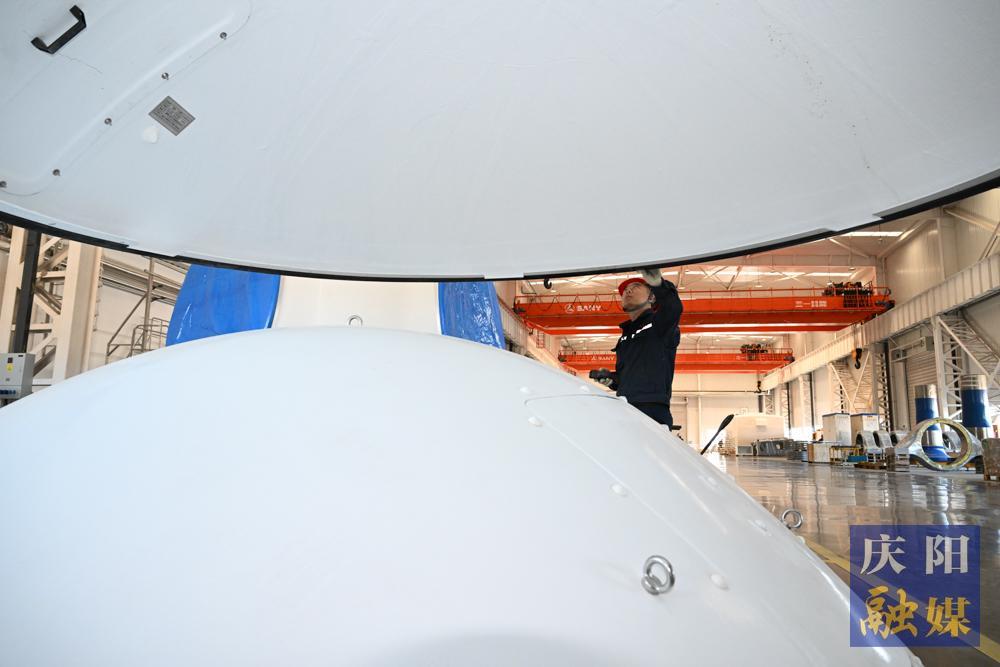 三一新能源裝備有限公司風電智能制造項目生產(chǎn)車間,工人操作機械安裝風電發(fā)電機導流罩。