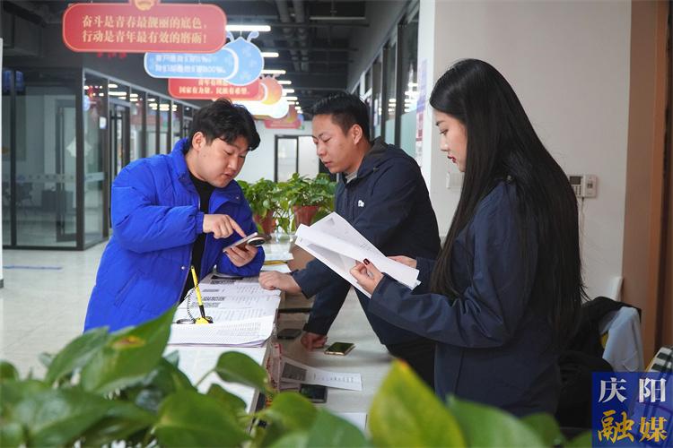 ▲環縣數字就業基地前臺工作人員和幫助在崗人員查看入職信息。