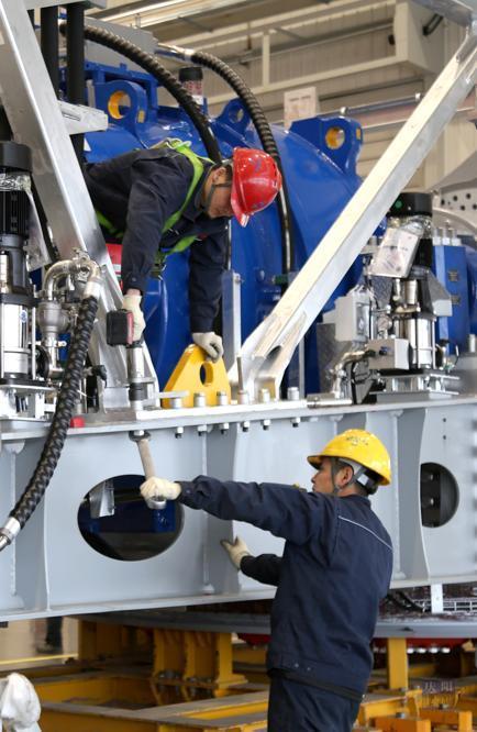 工人在吊裝零件。