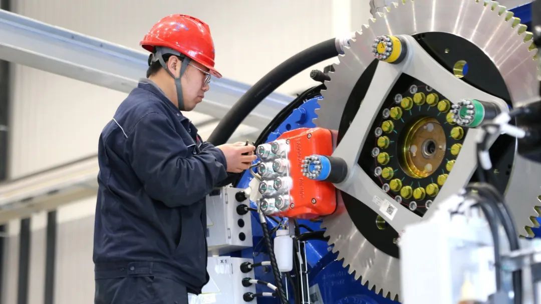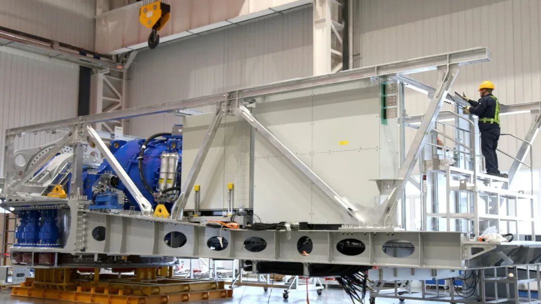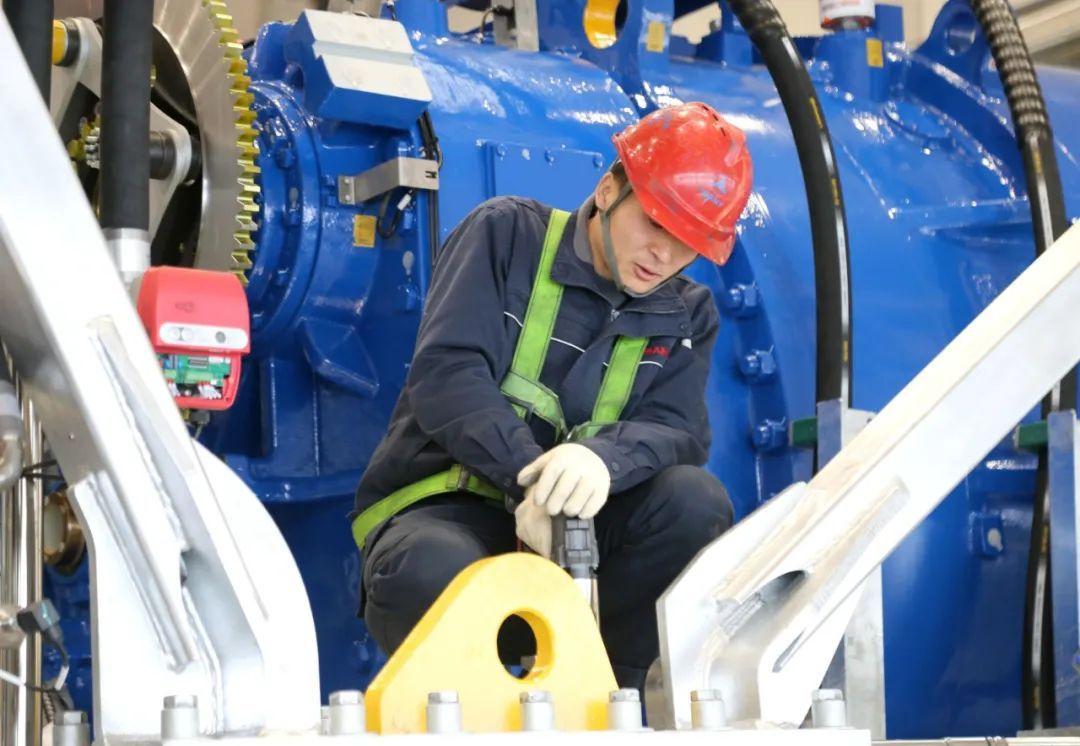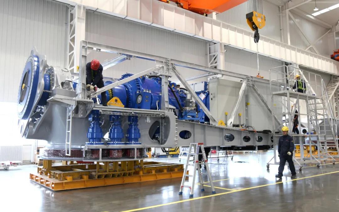 “我們目前生產的這臺組機為5.6兆瓦機組,滿發狀態下發電量每小時可達5600千瓦,機組主要運往華能慶陽新能源示范項目機組基地實施吊裝、測試、并網發電,2025年下半年公司計劃將單月產能提升20%?!睉c陽三一新能源裝備有限公司生產車間主任楊殿明說。