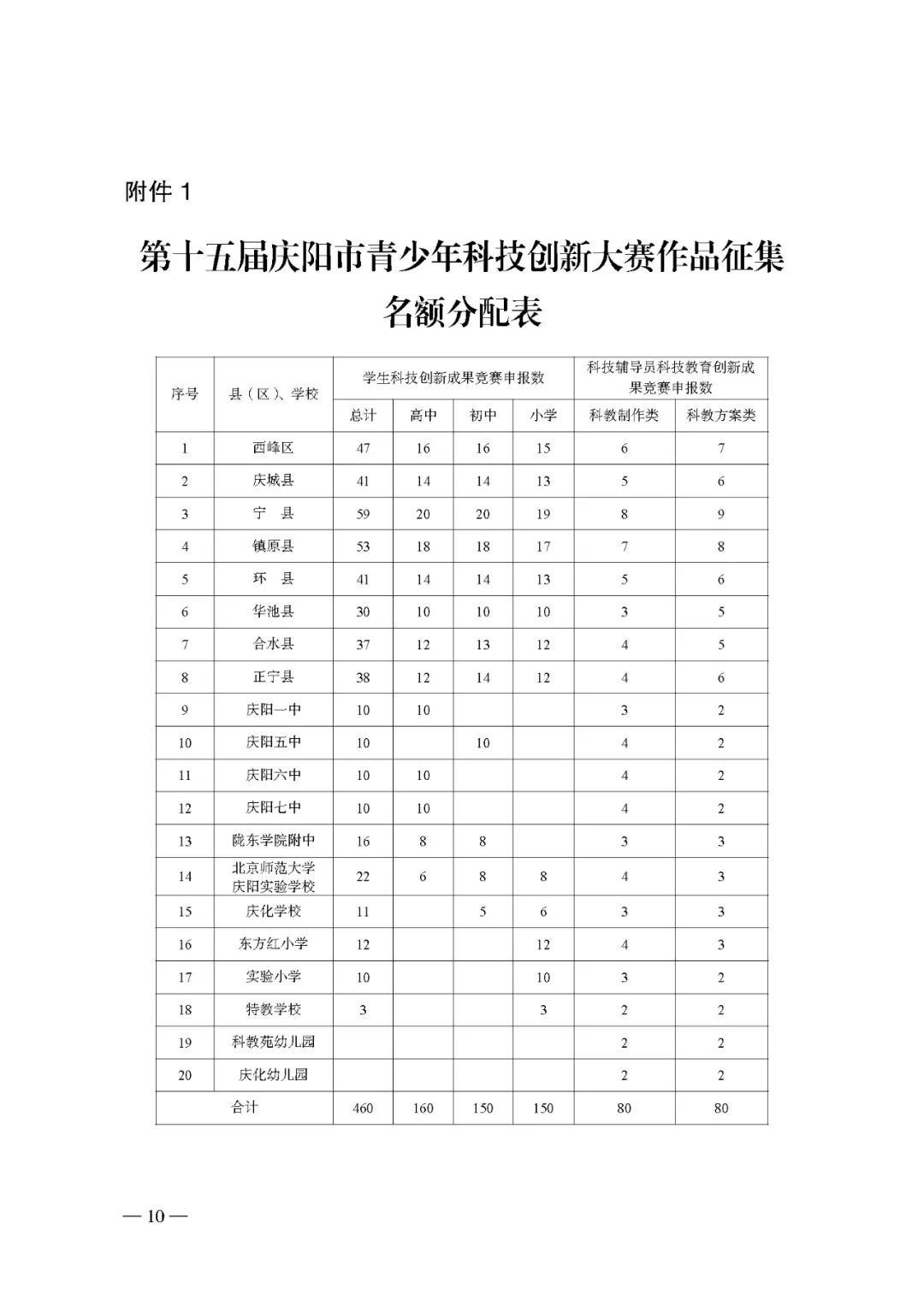 1.第十五屆慶陽市青少年科技創新大賽作品征集名額分配表
