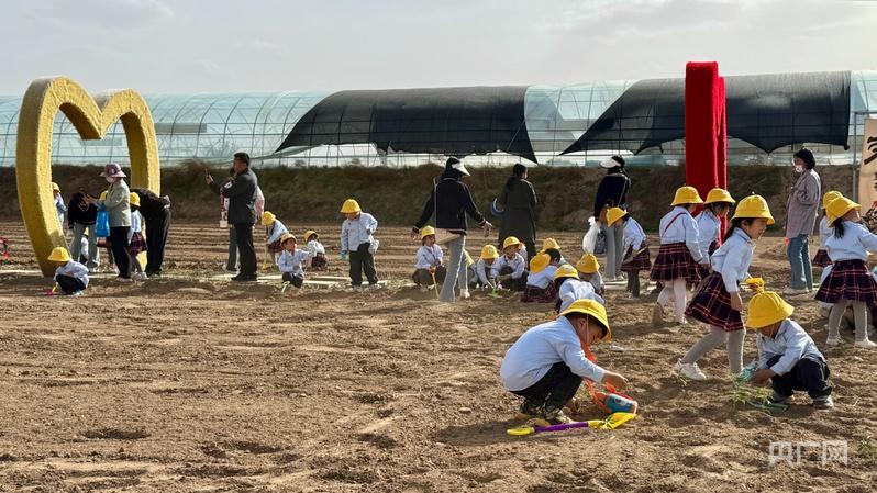 環(huán)縣實驗幼兒園師生在莊子峁田地里種植小樹苗(央廣網(wǎng)發(fā) 屈瑩 攝)