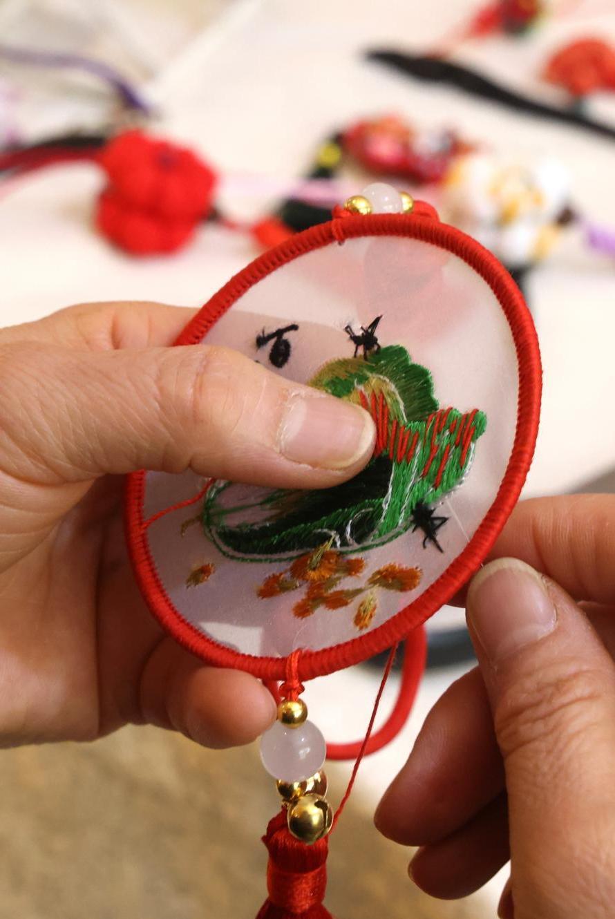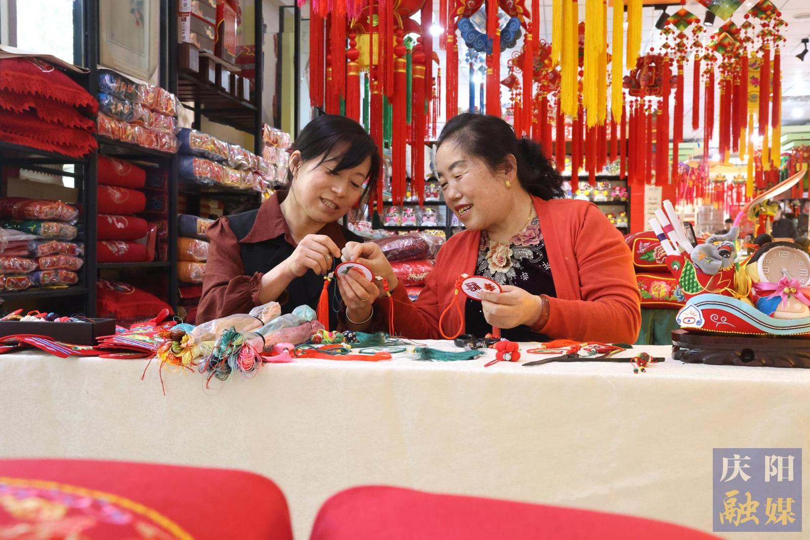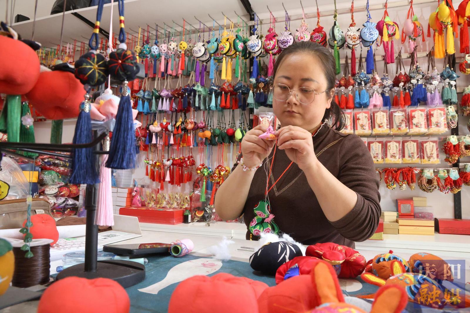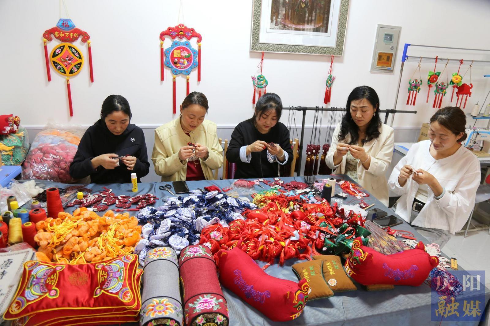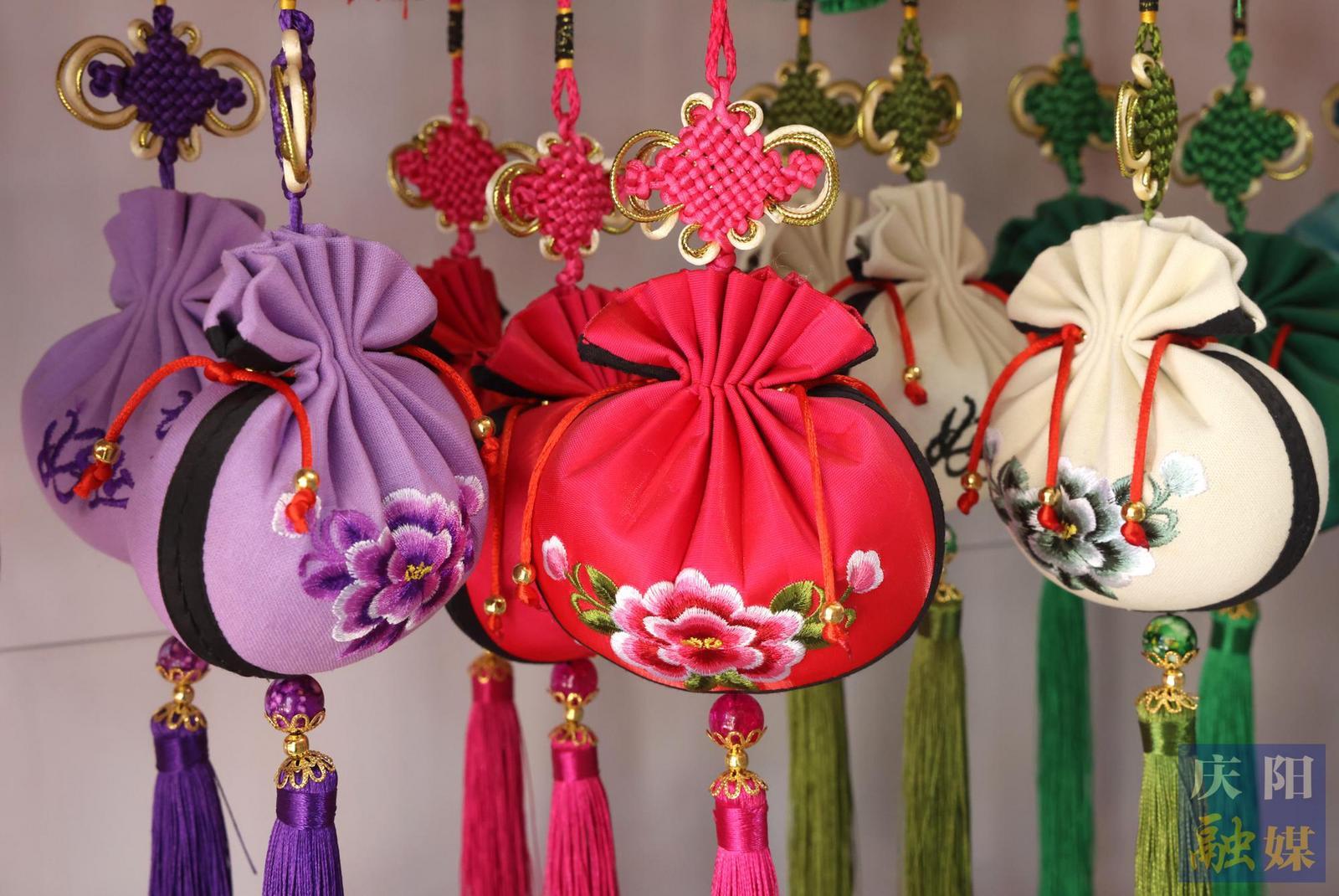 慶陽千繡坊商貿有限公司繡娘制作文創香包手機袋。