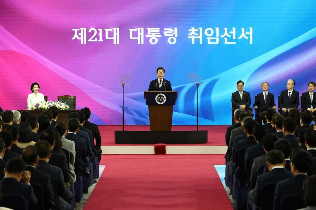6月4日,在韓國首爾,李在明在韓國國會發(fā)表就職講話。新華社發(fā)
