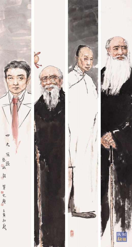張誠毅(右一)向慶陽市美術館捐贈他與學生合作的中國畫《四大巨匠》。