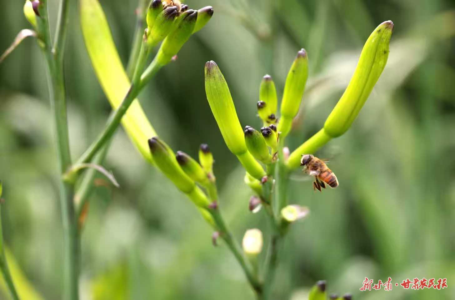 含苞待放的黃花菜吸引蜜蜂采蜜。