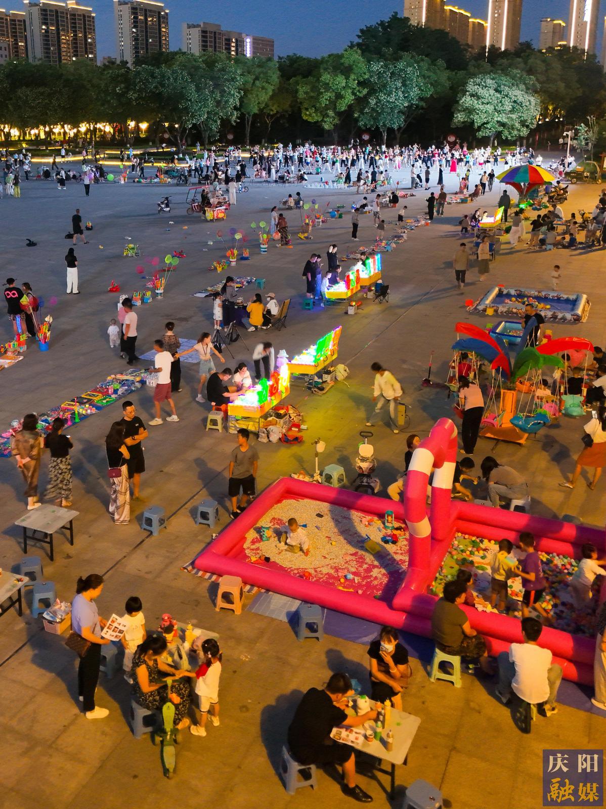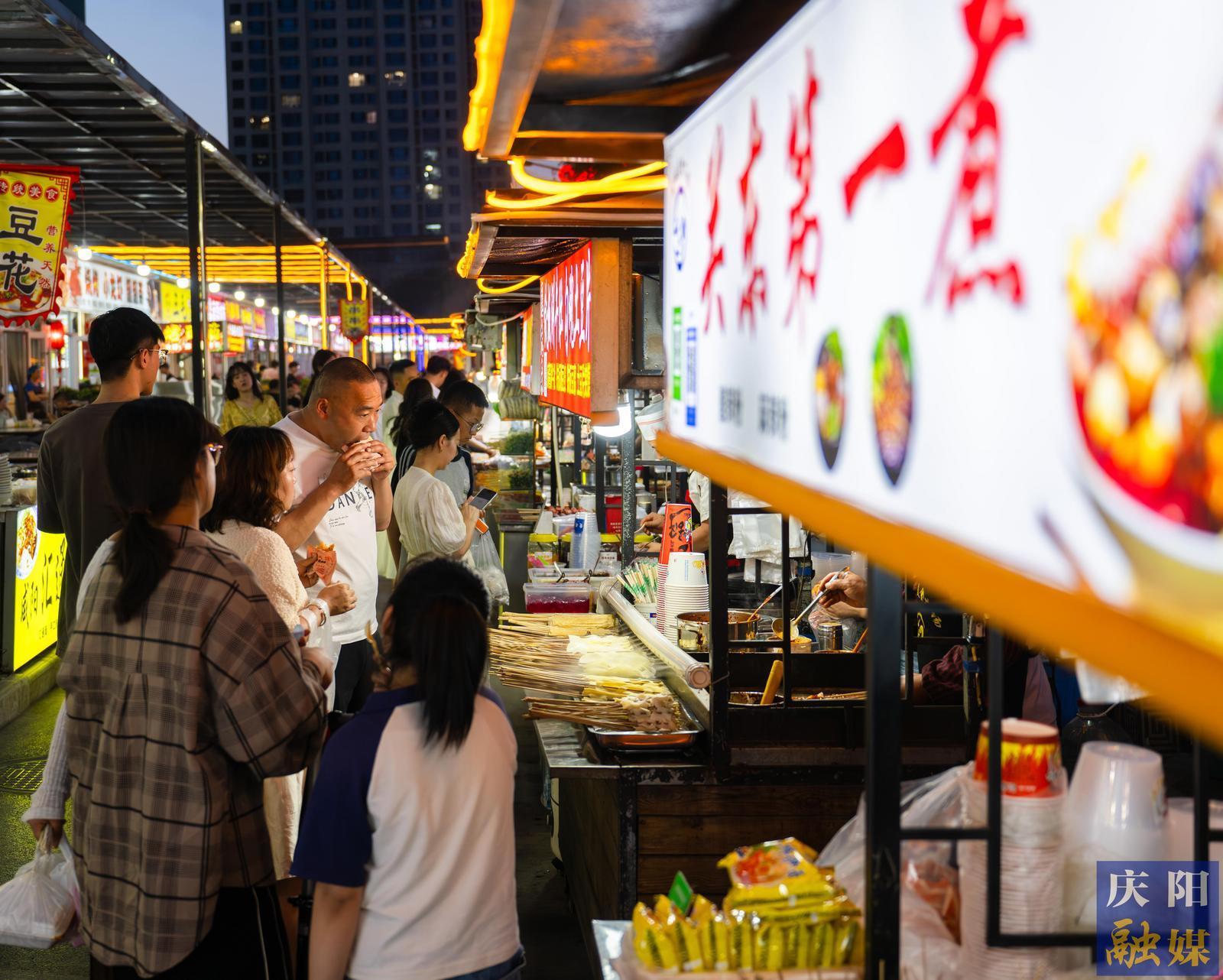 西峰區(qū)一家商業(yè)廣場(chǎng)潮汐夜市人頭涌動(dòng),美食、商品林立,濃濃的“煙火氣”撲面而來(lái)。