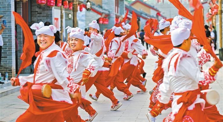 8月1日,位于慶陽市華池縣的長征國家文化公園南梁革命根據地核心展示園正式開園,演員表演南梁腰鼓迎賓客。該園通過現代科技手段和互動體驗設計,讓紅色歷史“活”起來。