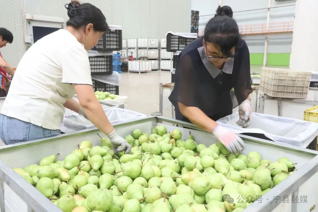 初秋時節,寧縣新莊興慶果業農民專業合作社的500多畝梨園迎來豐收季,合作社正組織人力忙著采摘、分揀、運輸,并通過電商銷售至全國各地。圖為8月19日采摘和裝箱現場。