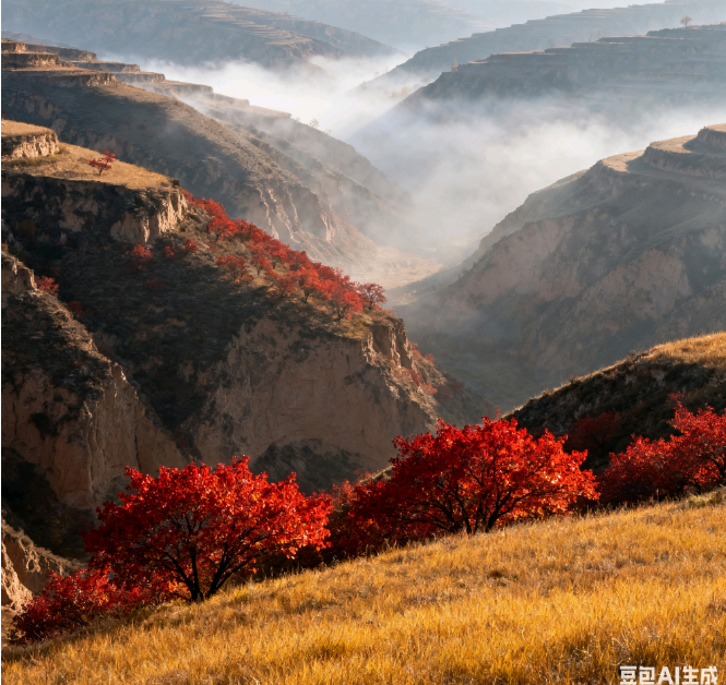 麻王川的秋天,是從黃土高原上那一道道溝壑爬出來的,先是偷偷地,繼而大張旗鼓地,將整個山川平原染成了金黃,山巒起伏,溝壑縱橫,秋色便在這高低錯落間流淌,如同打翻了的調色盤,將淺黃、深紅、蒼褐潑灑得淋漓盡致;麻王川的秋天,是從黃土高原深處蒸騰而出的,它不似江南秋日的柔媚,亦非北國秋光的清冽,乃是一種蒼茫而雄渾的壯美,仿佛大地在此刻吐納了千年沉積的厚重,將盛夏的燥熱盡數斂去,只余下廣袤與堅毅。